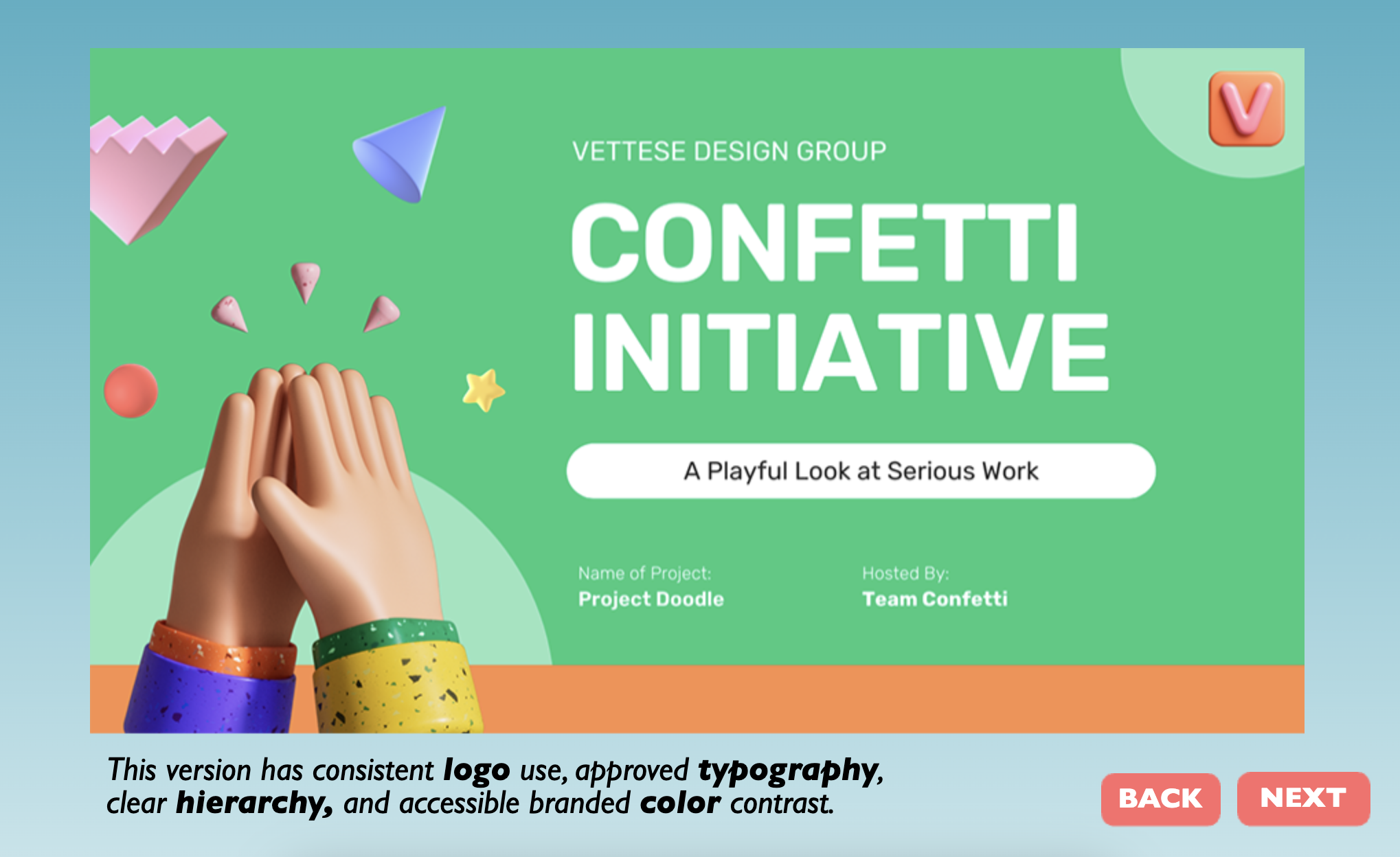 I created this microlesson in Adobe Captivate Classic focused on improving brand consistency across slide design. The lesson demonstrates how visual hierarchy, typography, logo usage, and a consistent color palette influence the viewer’s experience by contrasting a poorly designed slide with an improved version.